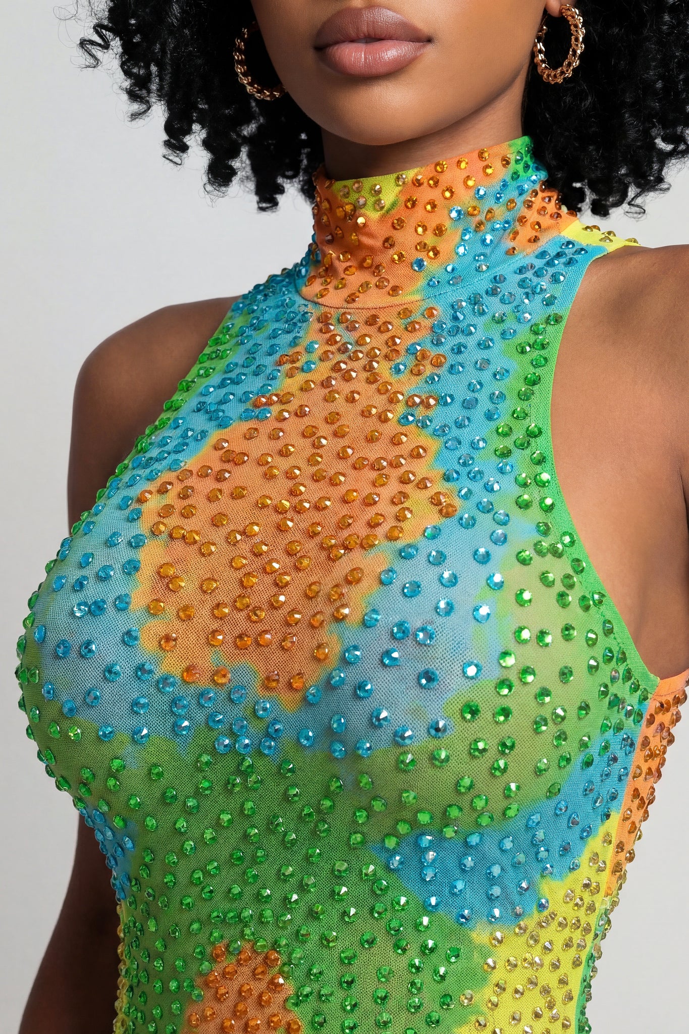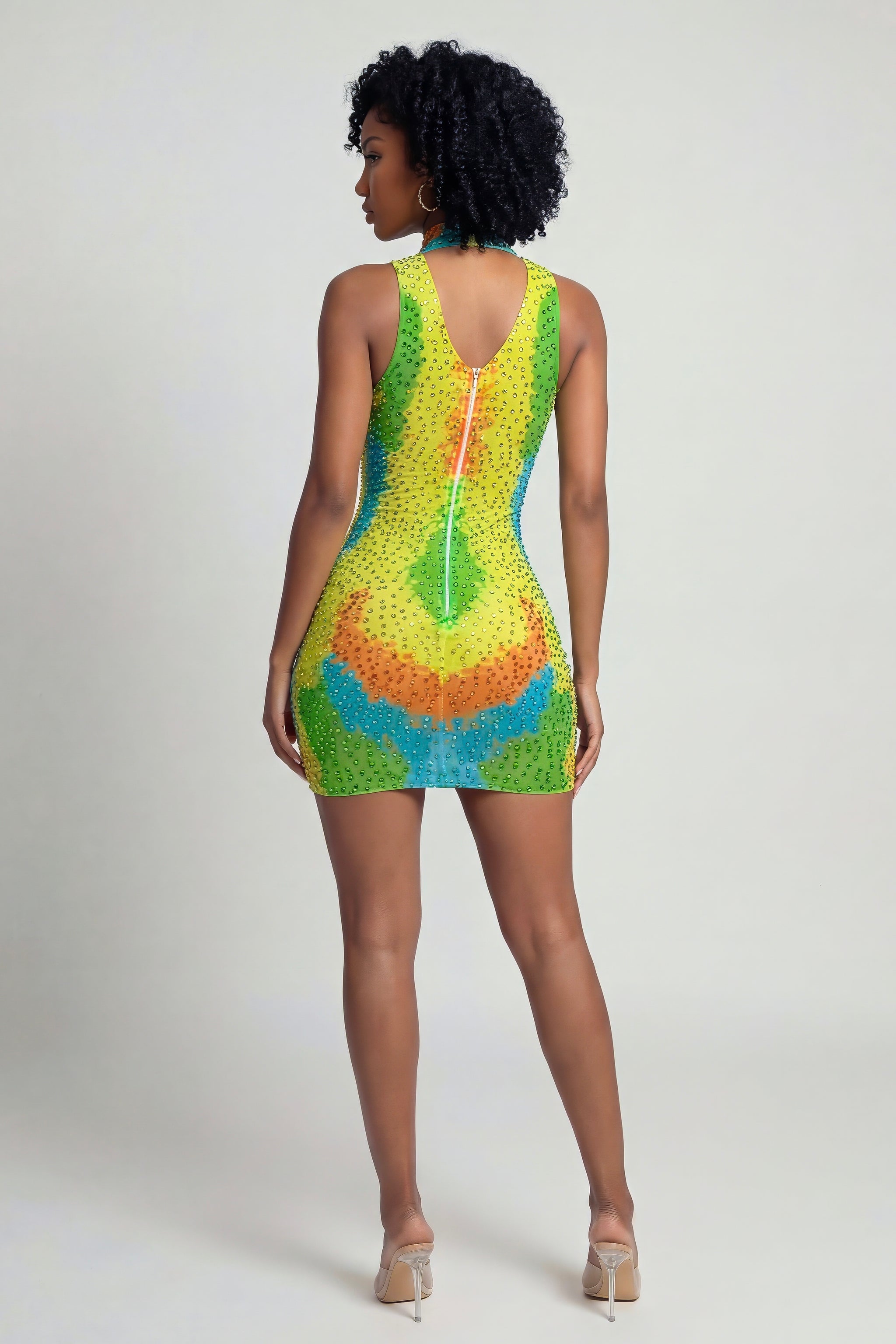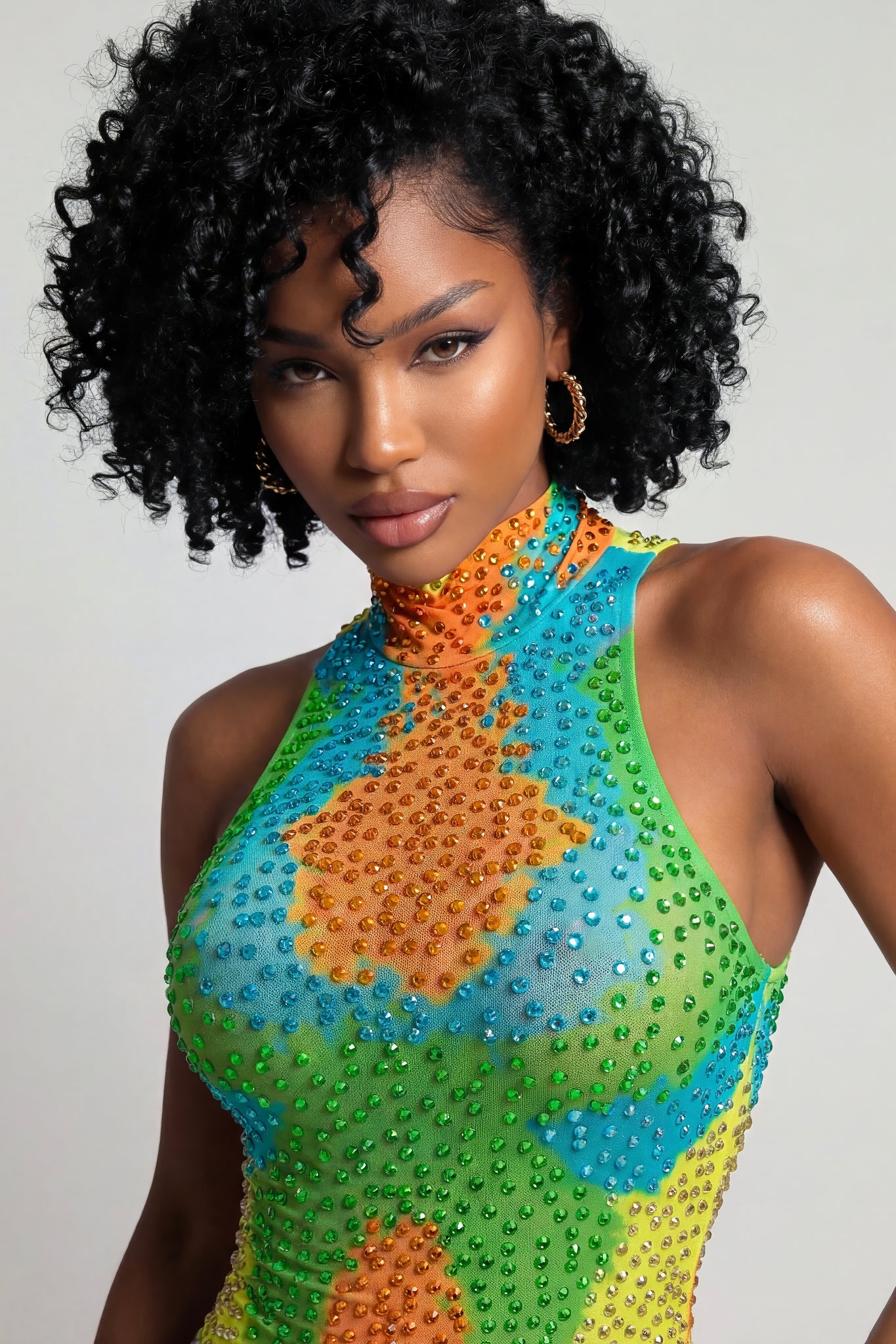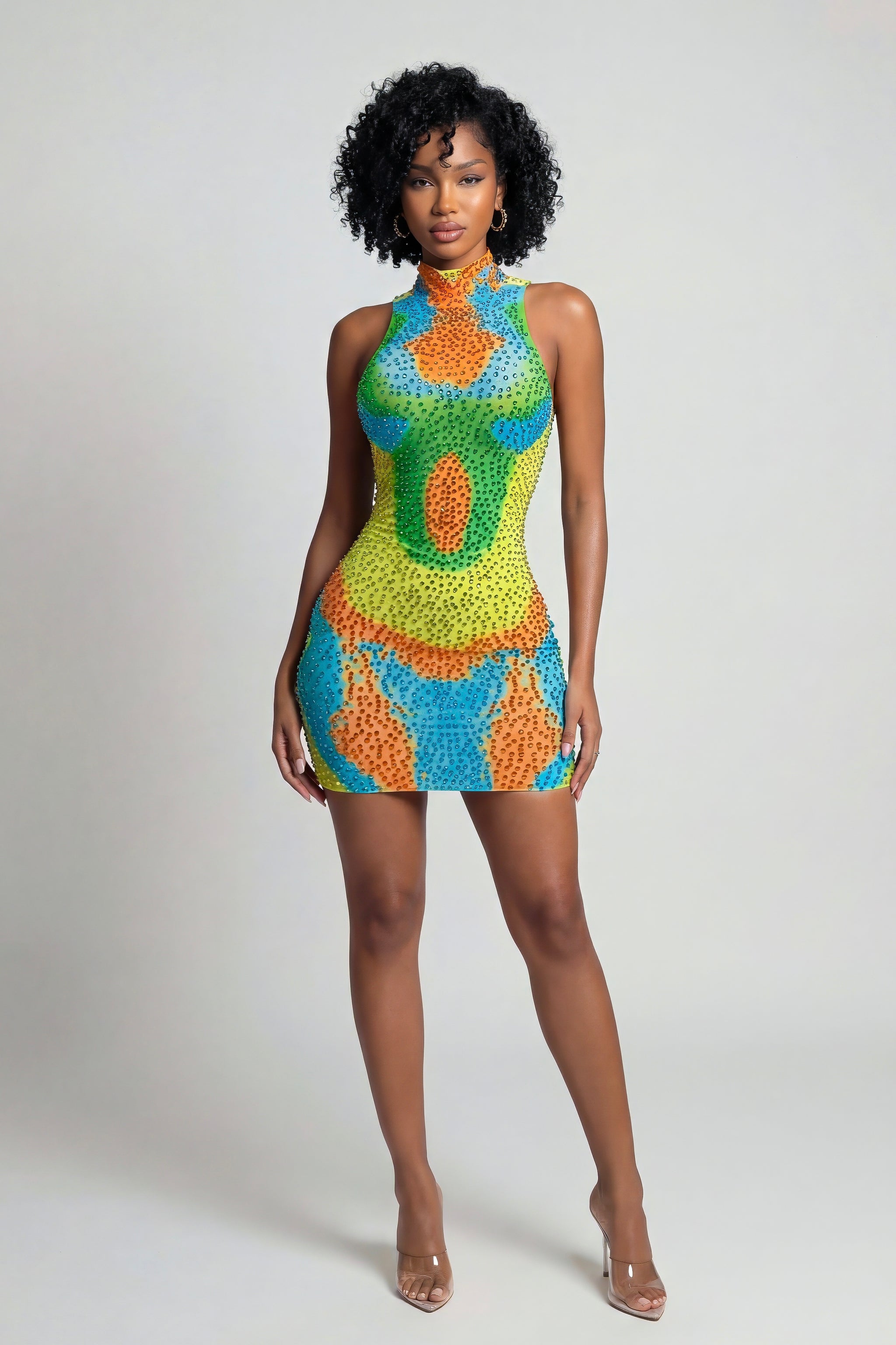 Make a stunning entrance in the Cryola dress, where vibrant colors meet dazzling rhinestone details. This sleeveless party essential transforms any occasion into a moment to shine. The shimmering embellishments catch every light, ensuring you're the focal point of the room. Designed for those who embrace bold style and aren't afraid to sparkle, this dress delivers the confidence and glamour needed to own your night. Perfect for celebrations, nights out, or whenever you want to feel absolutely radiant.