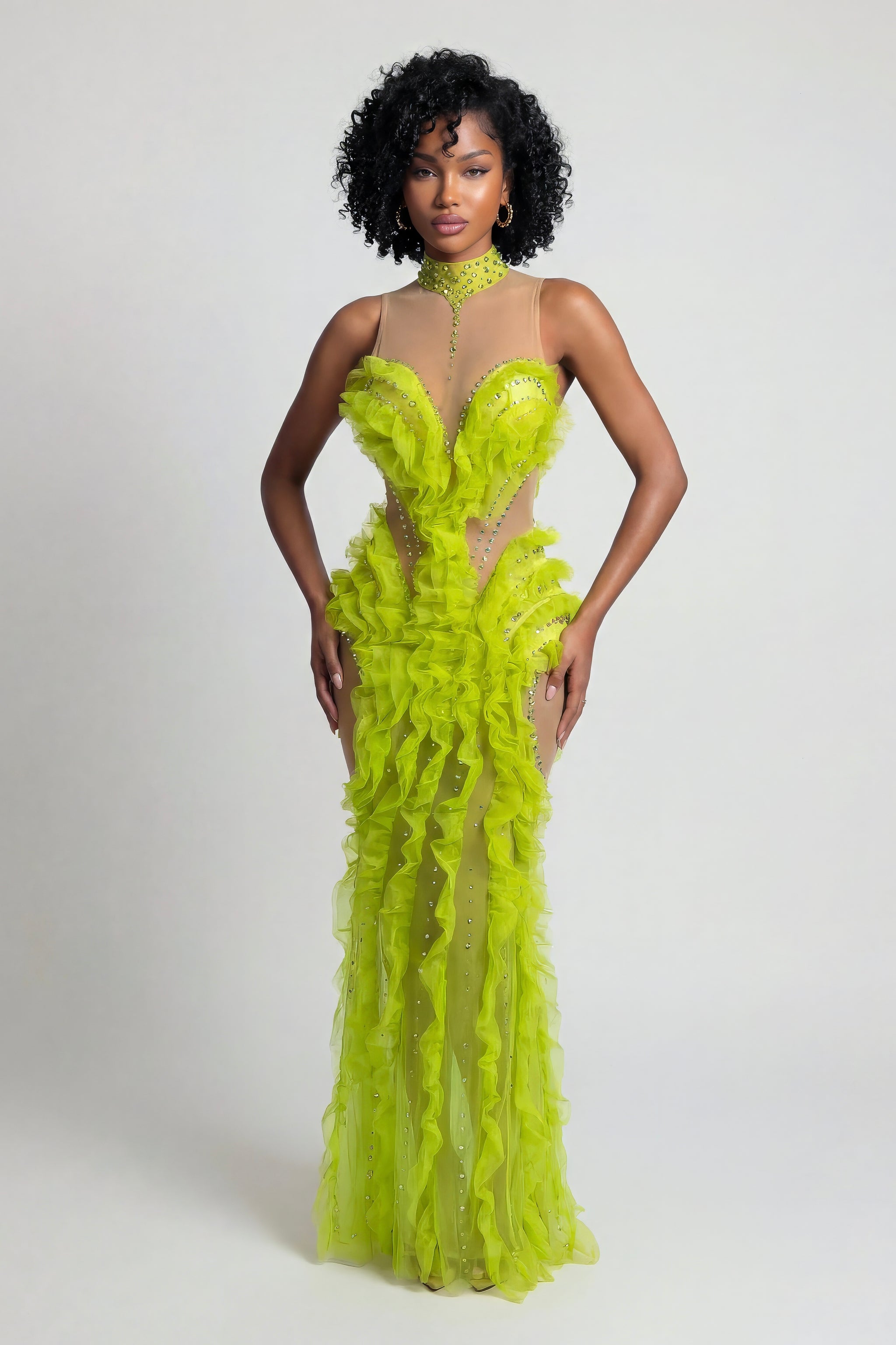 Elevate your spring wardrobe with the Sierra maxi dress—a show stopping piece that combines elegance with playful charm. This stunning design features a cozy turtleneck neckline and eye catching rhinestone embellishments that catch the light with every move. The signature playful ruffle detailing adds movement and dimension, creating a silhouette that's both flattering and fun. Perfect for spring occasions, from casual outings to special events, this dress lets you express your bold, confident style. Make a memorable impression in a piece that's as unique as you are.