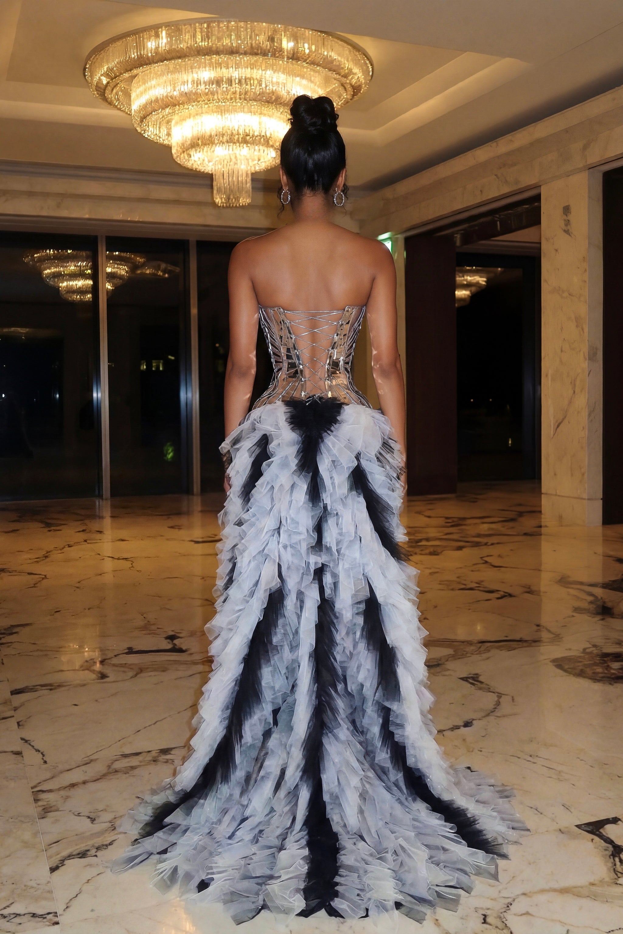 The corset top cinches your silhouette with dramatic flair, while the accompanying long tail skirt flows with an ethereal, cosmic elegance. It's a statement piece that makes you feel powerful, mysterious, and absolutely irresistible. Perfect for those who dare to embrace their boldest self and command attention in any room. Elevate your confidence and unleash your inner vixen with this show stopping ensemble.